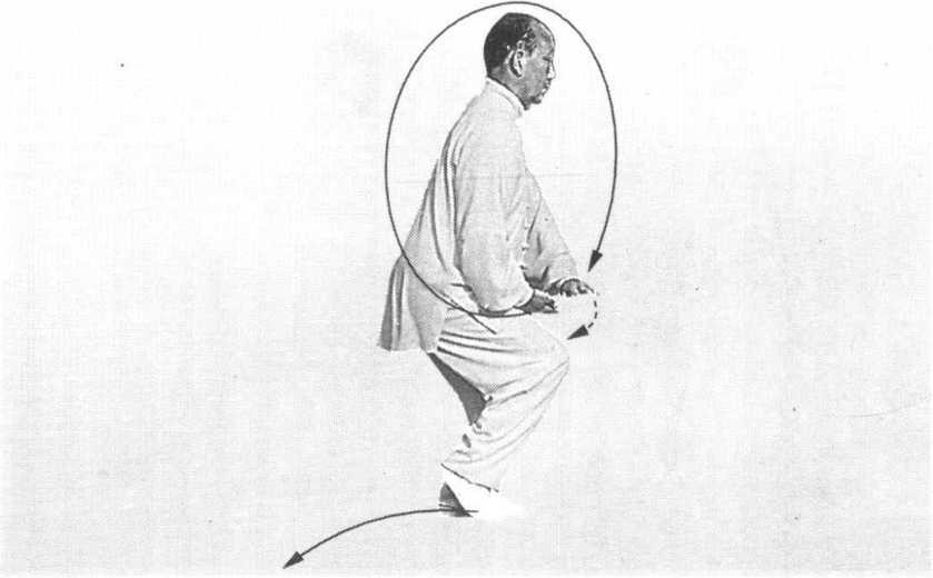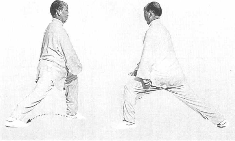 右脚在左脚旁下落,脚尖点地。同时,左掌 内旋,弧形下落至左腹前,手心向下;右掌外 旋,弧形下落至右胯旁,手心向上。眼向东平视 (图 33 )。