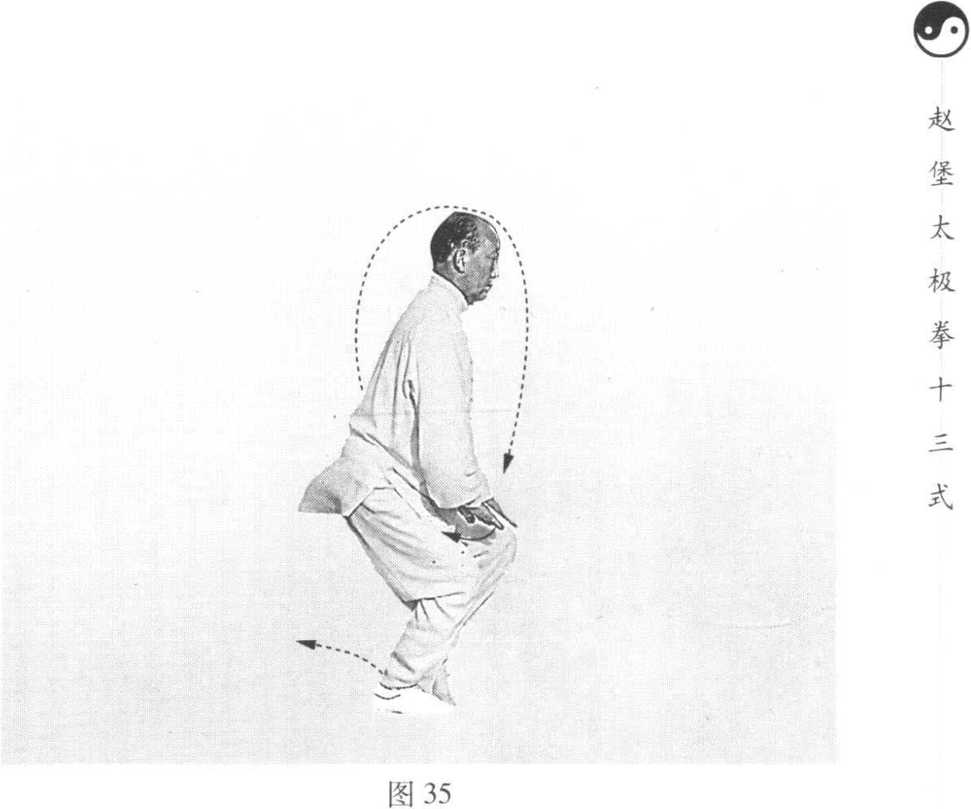 左脚抓地;右脚微上提即向西南方向退一 步,成左弓右蹬步。同时,左掌变勾手从膝关节 内侧绕膝搂至左腿外侧,勾尖向后;右手由下向 右、向后(西南)、向上经头顶、脸划弧落至小 腹前,手心向下,指尖朝东北。身要中正。眼向 东平视(图34、附图34)。