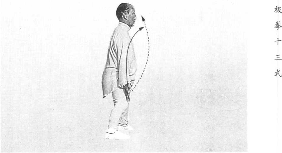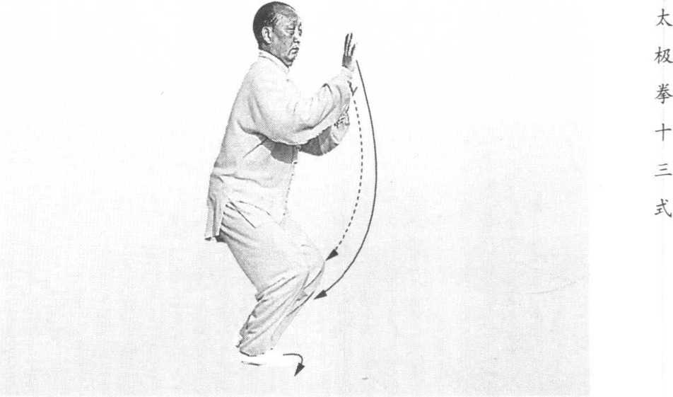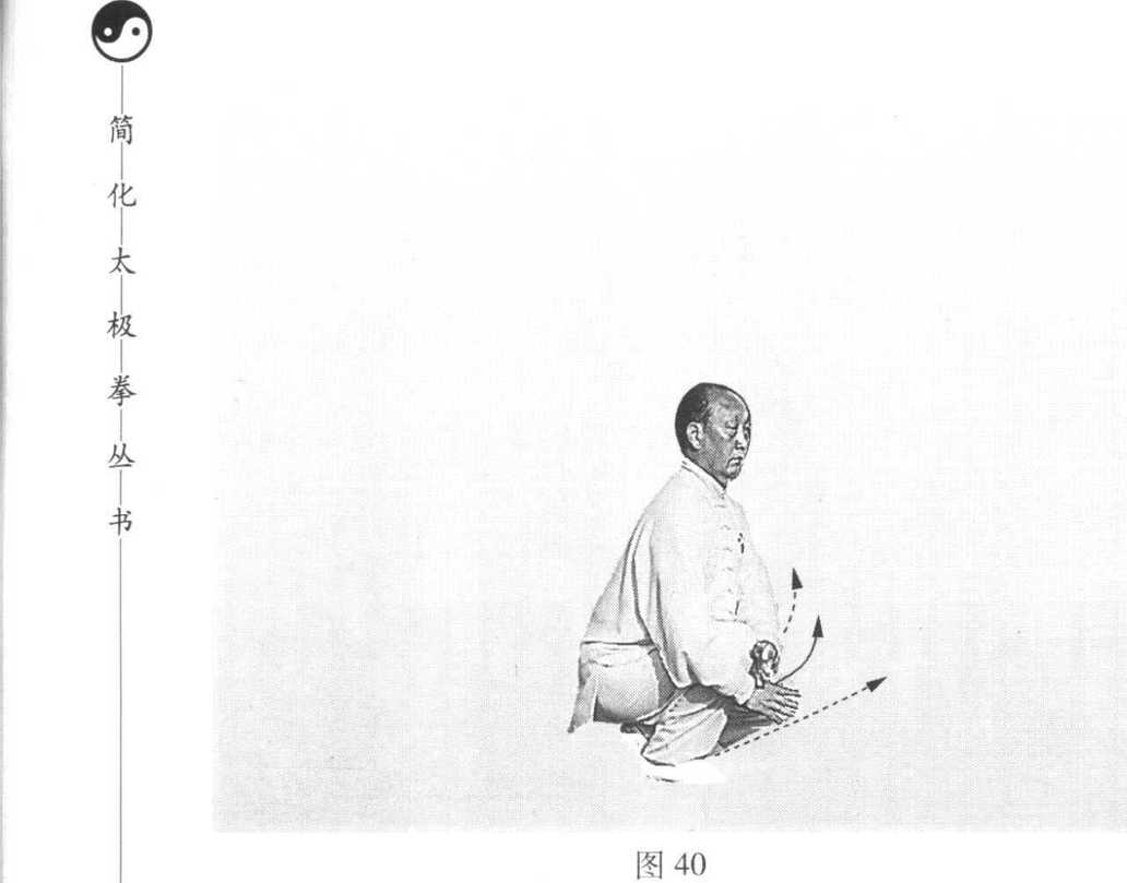 右脚尖外撇朝南偏东,重心在右脚,身体下 蹲。同时,双手交叉成十字手,弧形下落至右膝 前,右手在外,手心向下;左手在里,手心向 内。眼向东南方向平视(图40)。
