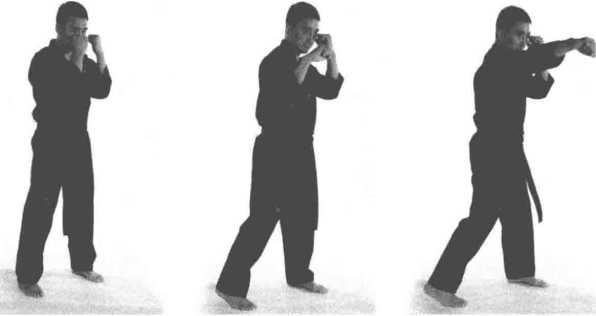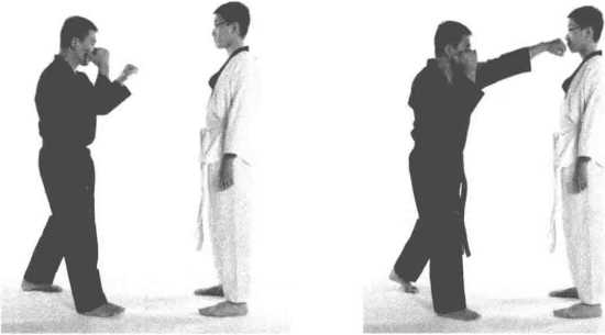 以右直拳为例自然站立双手迅速握拳抬起右脚蹬地以右脚前脚掌为轴向内扣转同时右拳迅速向前击出转腰顶肩力达拳面。(图1-38-图1-40)