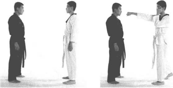 (-)动作过程1 双方对峙。(图2-36)2 乙方右直拳攻击甲方。(图2-37)3 甲方下潜右直拳击打乙方裆部。(图2-38)(二)动作要点1快反应迅捷下潜、直拳同时完成。2 准击打裆部一击必中。3 狠击打凌厉。一击制敌。图2-36 图2-37图2-38