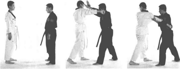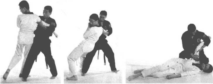 (-)动作过程1 双方对峙(图2-66)2 乙方右摆拳攻击甲方头部甲方上步掩手。(图2-67)3 甲方左手缠绕乙方右臂右手向前下方推按乙方头部同时上步绊摔,将乙方控制于地面。(图2-68?图2-71)图2-66 图2-67 图2-68图2-69 图2-70 图2-71(二)动作要点1 反应迅捷上步掩手封手快。2 推按乙方头部绊摔连贯。第三节争