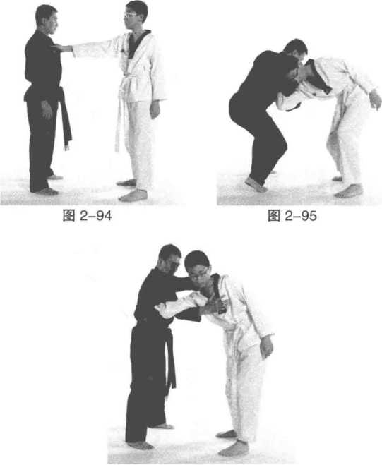 (一)动作过程1 乙方右手抓甲方胸口衣服。(图2-94)2 左手扣住对方的手转体下砸肘打击对方肘窝同时降重心右手臂向前插挑缠绕乙方手臂左手拇指同时向前插按对方右侧耳根处。(图2-95、图2-96)图2-96(二)动作要点左手扣住对方的手转体下砸肘同时降重心。