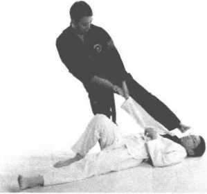 2 甲方右手击裆左手抓拉乙方头发至对方后仰失去平衡倒地。右拳击头左脚蹬踩。(图2-101—图2-104)