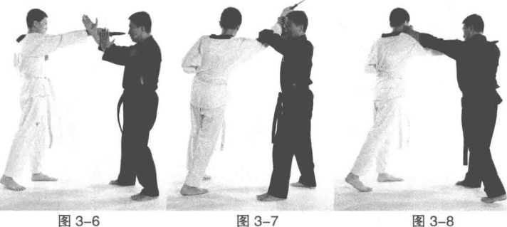 (-)动作过程1 乙方直刺甲方面部甲方外侧十字手封手。(图3-6)2 甲方右手刁住乙方手腕回拉同时左拳击打乙方头部。(图3-7?图3-8)3 甲方右手前推乙方右臂同时左手回穿并抓握自己右手腕。(图3-9)4 甲方锁住对方手臂上右脚绊摔将乙方控制于地面。(图3-10-图3-11)侧十字手封手快右手刁手牢固左拳毁灭性击打上步折臂转体快速协调。