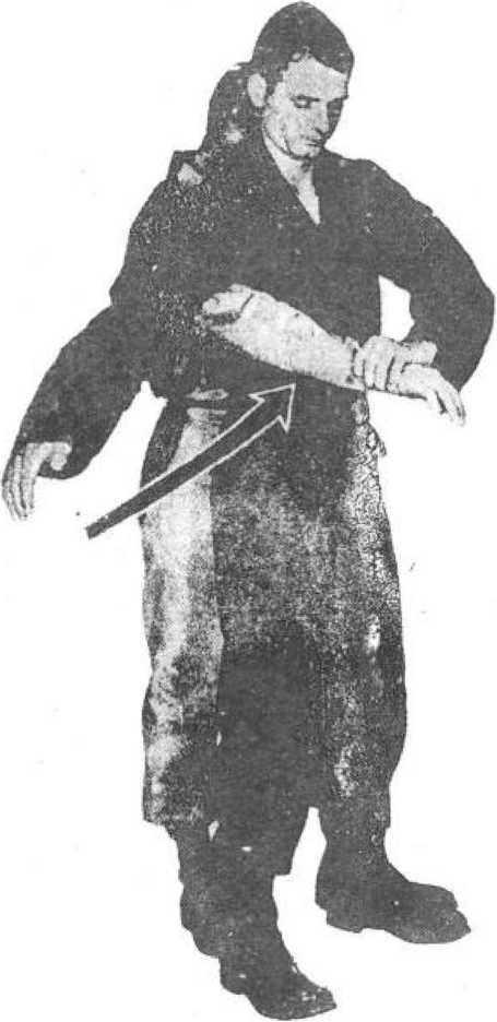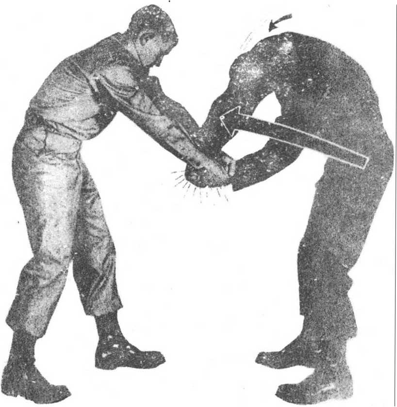 (2)以右脚为轴,跨左腿向右后侧转体,绕到对方身侧, 扣紧右臂,左手向上推压,可令其肘关节受到严重创伤。(图 12—2)