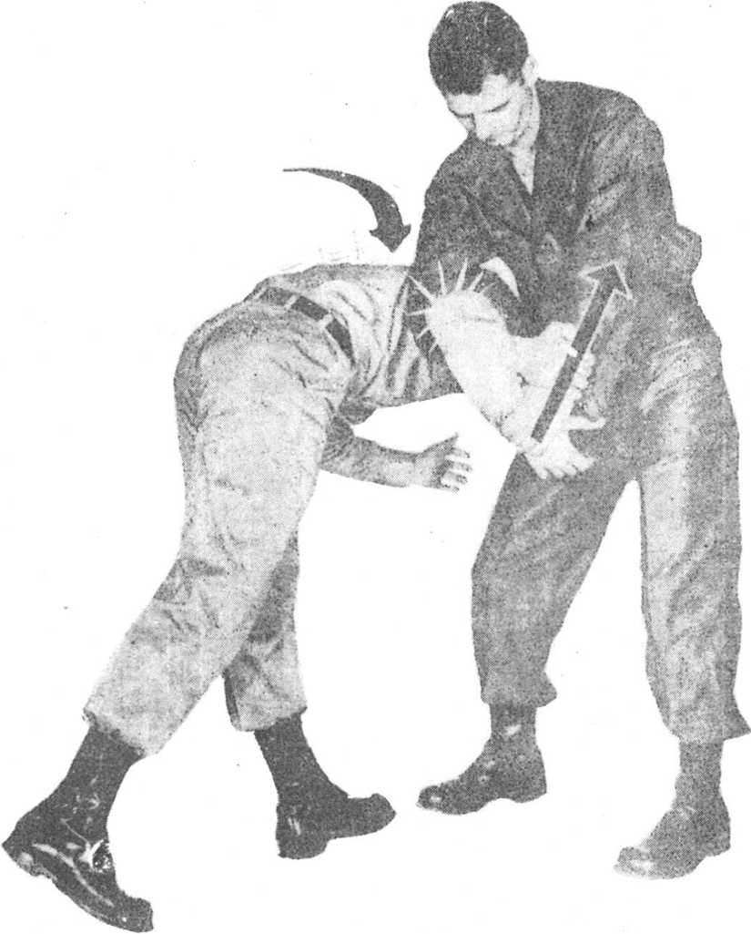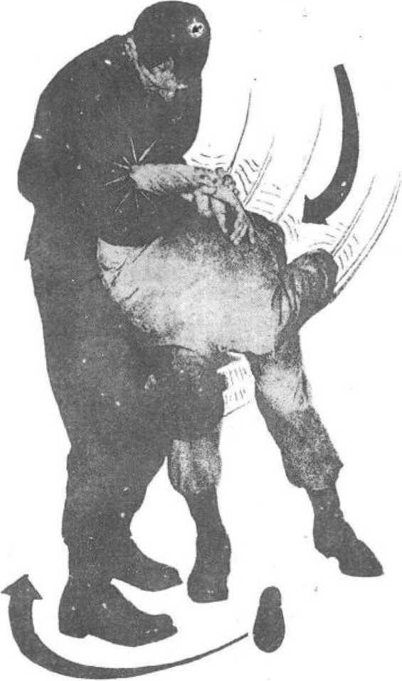 (3)身体向右侧晃动,借势迅速向左卞侧弯腰,,躬背挺 腿,以臀部撞击其大腿根部,将其从背后摔向前方。(图11- 3) .