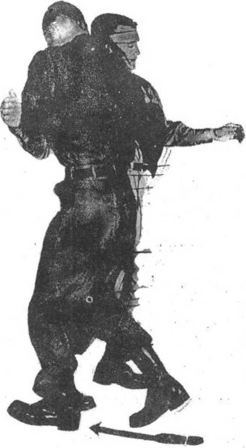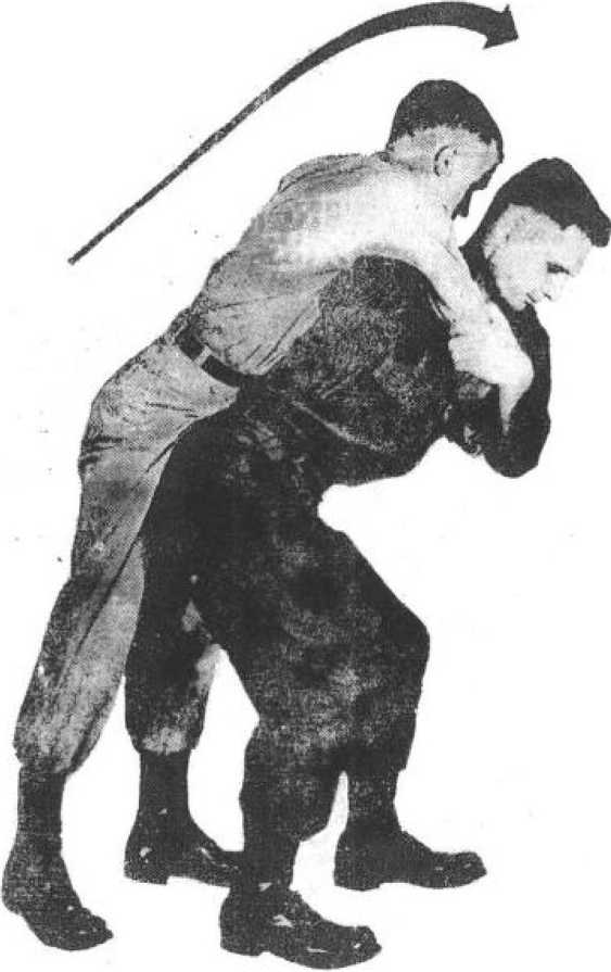 (1)以左手迎面抓住对方击来之右手腕,顺势向左转体 180度,右手揪其肩部衣服,躬背弯腰、挺腿发力,以臀部顶 其小腹部,将对方从右肩上方背摔过去。(0 4-1)图4—2狠抓敌衣服(2)以右手迎面阻击对手并揪住其左面衣领,跨步进身, 右前臂顶在对方右臂腋下,向左转体180度,左手抓住其右 手腕,同时用力,将对方从背后向前摔去。(图4—2)图5—1臀部转动摔打