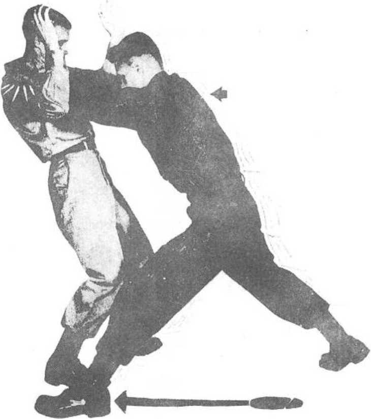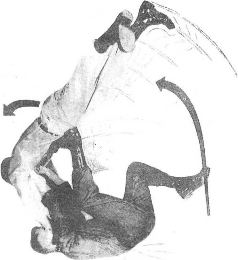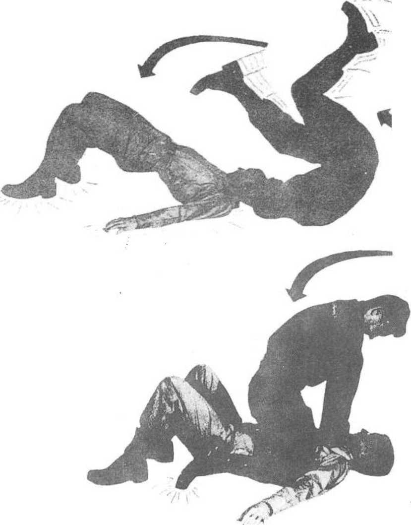 (1)当对方向你猛扑过来时,在防守中以手揪其衣领,身 体顺势向后仰,并迅速抬腿以里脚掌抵住其小腹。(国7-1)图7—2 后滚翻摔(2)借助对方的前冲力,双手向胸前揪拉,顺势向后滚 翻。以脚为支点,让其失去平衡的身体悬起,蹬向头顶方向。 (3 7—2)图7—3 后滚翻摔(3)双手抓住不松手,倒地的同时躬背团身收腹双臂回 拉,将对手摔向地面,(图7—3)趁势起身骑坐在对方的胸腹 部之上,(图7—4)双手掐紧其喉部或施以击打。图8-1绊腿摔打