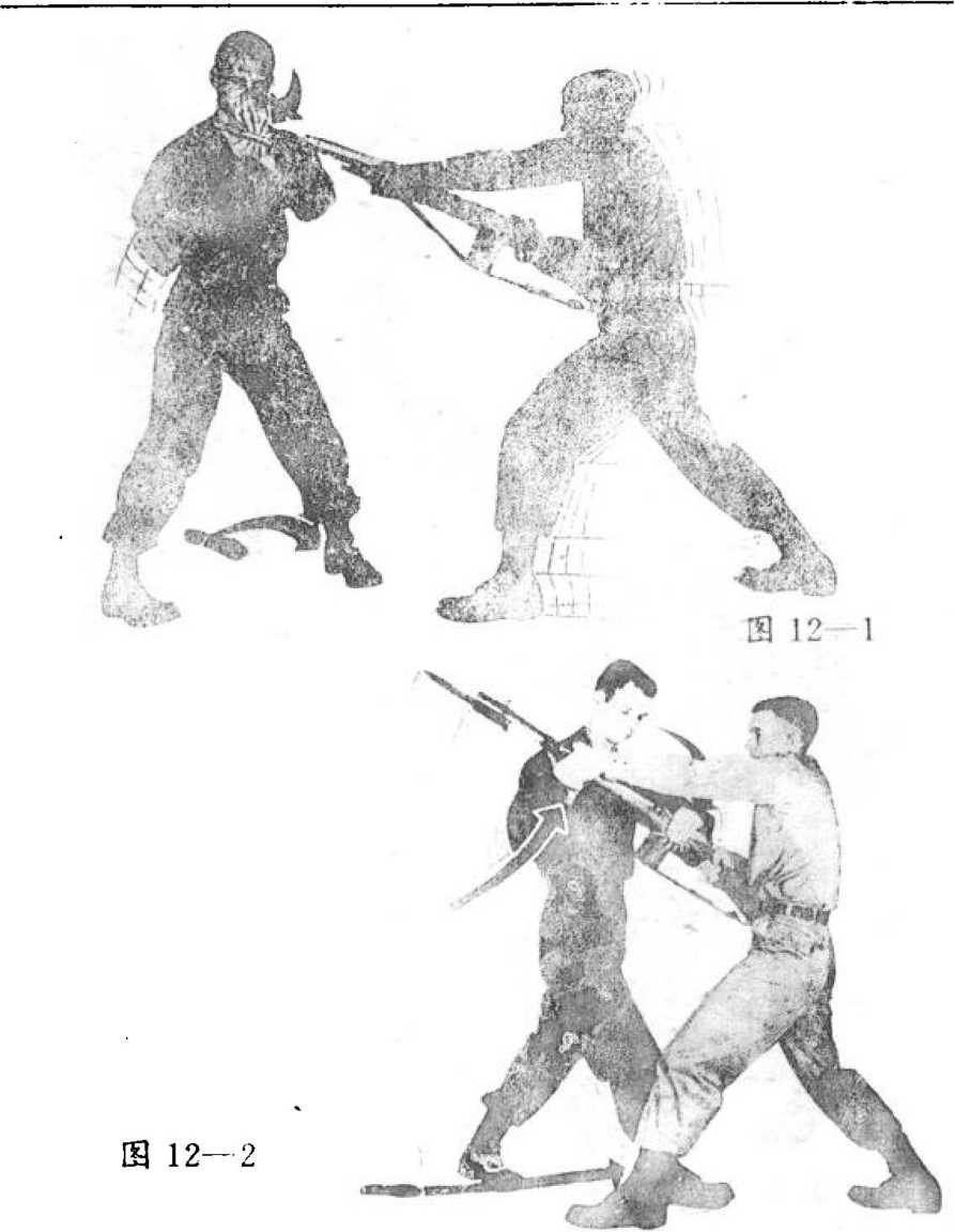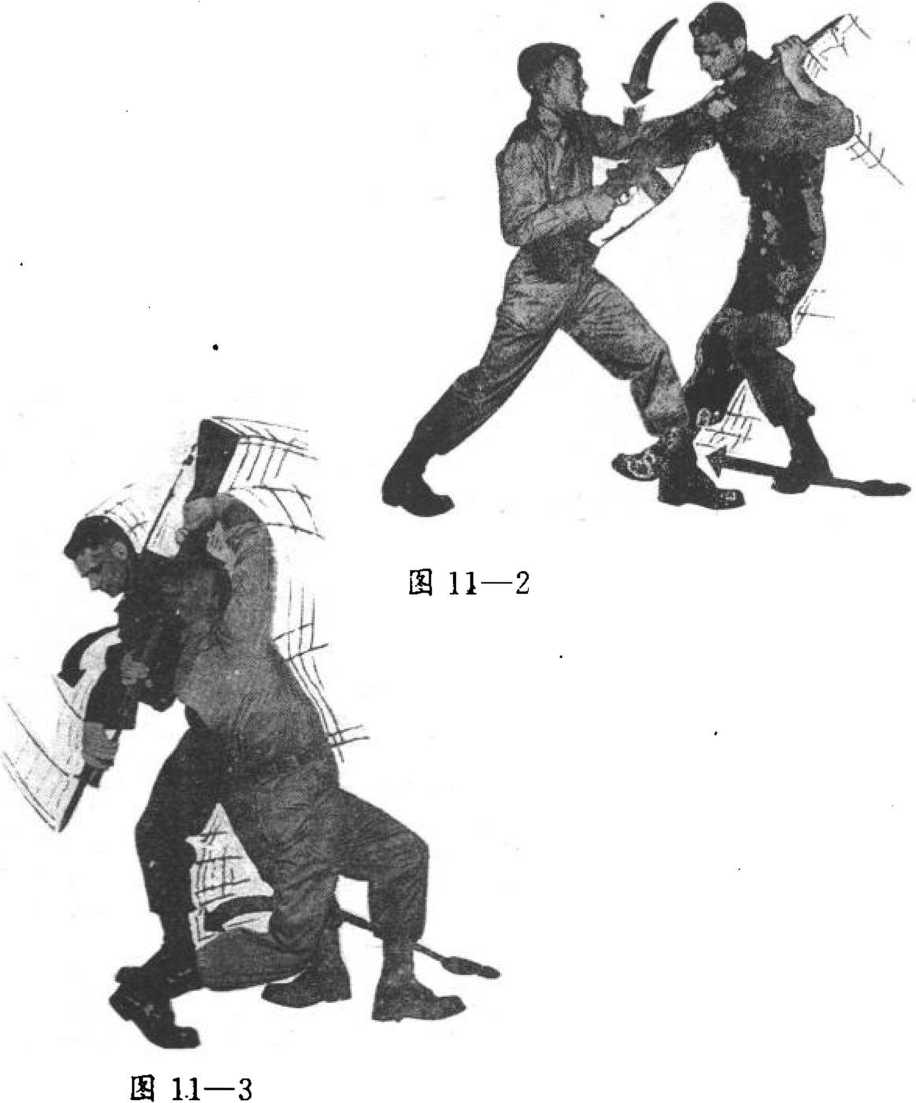 .用右掌将对方迎面刺来的刺刀向左侧推拍;右脚向右前 侧跨步。(ffl 11—1)左手向上抓住枪管向上推举,同时以右掌外侧猛力砍对 方左肘内侧关节处,左脚向右前侧跨步至对方身体右侧,双 臂发力将枪成弧形向对方肩后扭去。(图