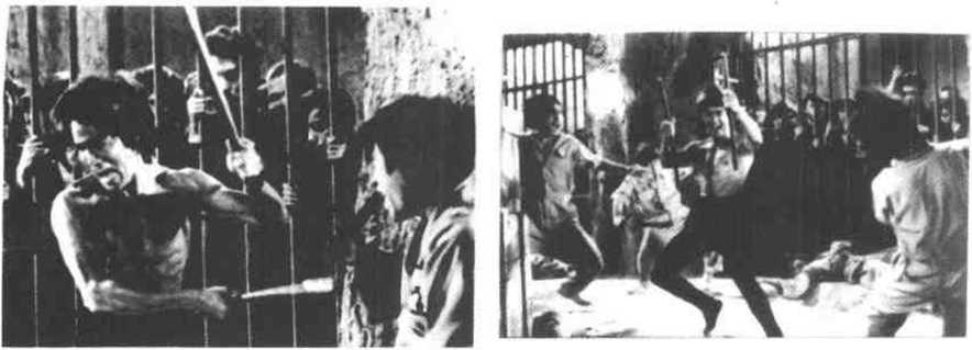 李小龙的短棍技击法是通过电影龙争虎斗展示给世人的他在该片中的地牢搏斗的片段里(图424),将短棍的打斗技术推向了极限状态。