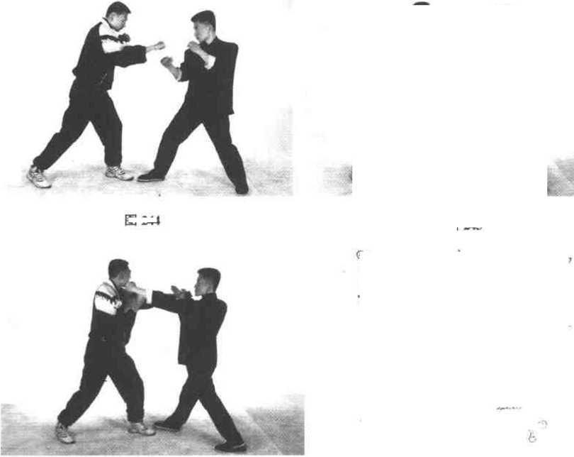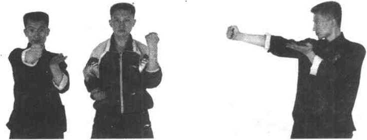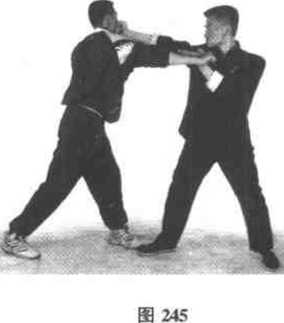 练习时由戒备式开始在左手轻快外挡的同时将右拳沿中线打出(图242),目标是对手的下巴或心窝。图243为内侧高位格挡法的侧面示范。