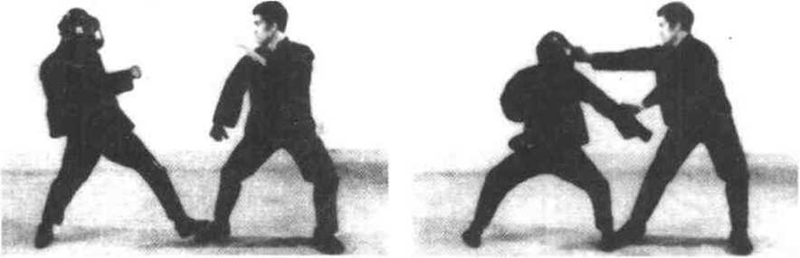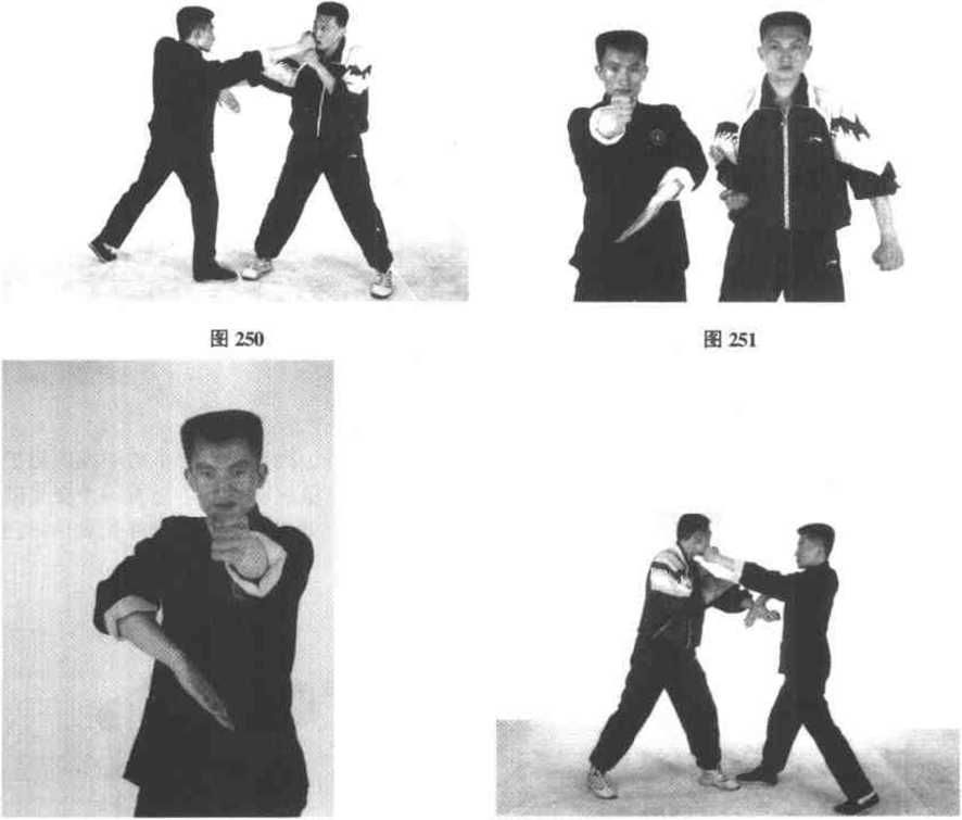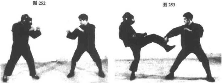 在振藩截拳道中这是一种主要用来防御来自胸部以下的踢打的轻快的拍挡动作(图248)。