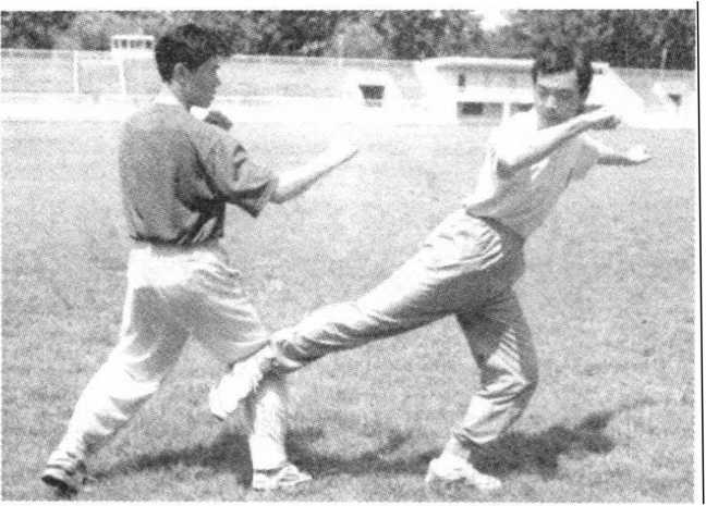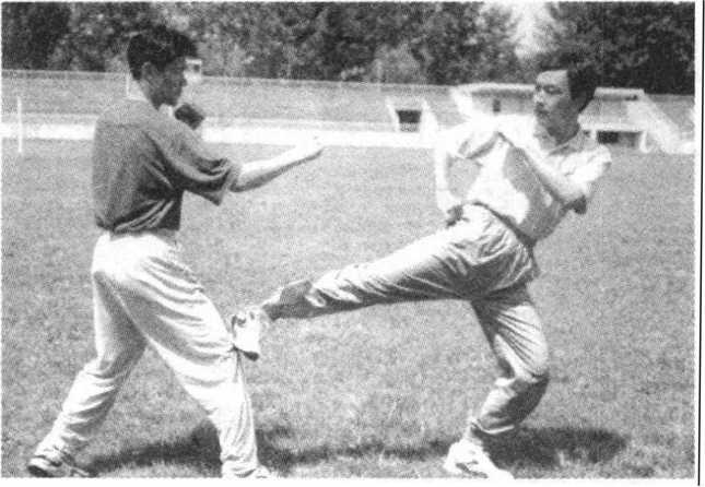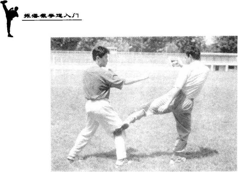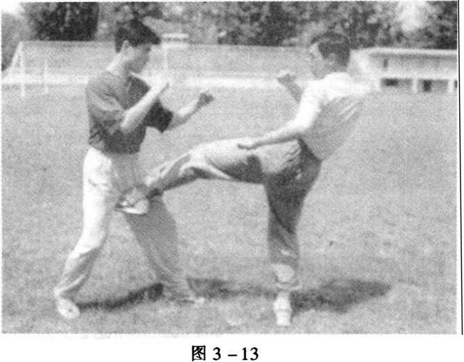 (七)踢击裆部。敌我双方警戒式对峙。敌上前脚,欲发起攻 击。我迅速起左脚(后脚)插入其中门,由下向上踢击其裆部,力 达脚背(图3 - 13)。