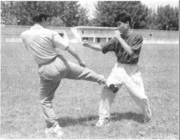 (六)向内横扫踢敌膝弯或大腿内侧。敌我双方警戒式对 峙。敌上前脚,欲发起攻击。我迅速向左拧腰,以左脚为支撑脚, 起右脚(前脚)向内横扫踢敌膝弯或大腿内侧(图3 - 12)。