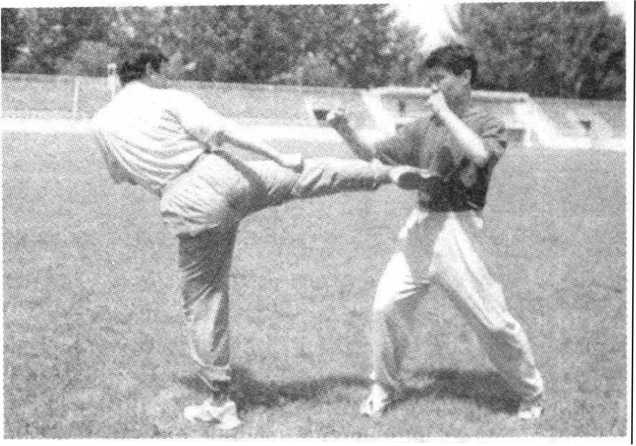 (一)刺踢敌心窝。敌我双方警戒式对峙。敌上前脚,欲发起 攻击。我左脚(后脚)迅速向前垫上一小步,同时右脚(前脚)屈膝 提起,快速、准确地刺踢敌人心窝部位,力达脚尖(图3 - 14)。