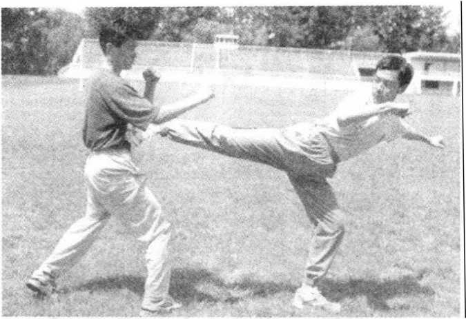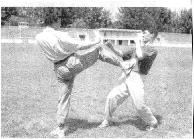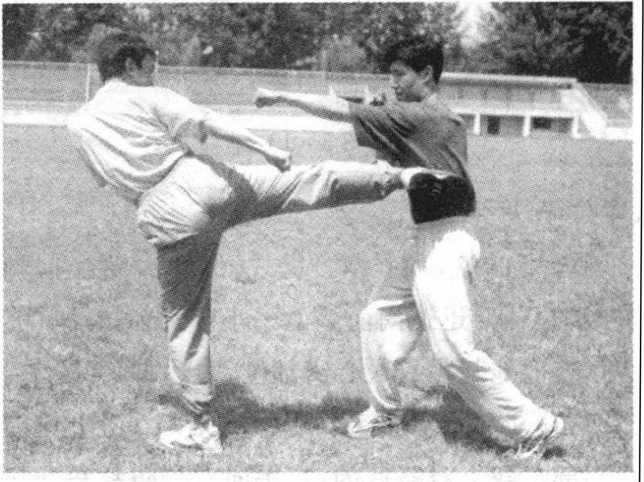 (二)横扫踢肋部。敌我双方警戒式对峙。敌上前脚,后手直 拳打向我面部。我上身略后闪,左手向右拍防敌拳,同时向左拧 腰,闪电般起右脚(前脚)向内横扫踢敌人肋部(图3 - 15)。