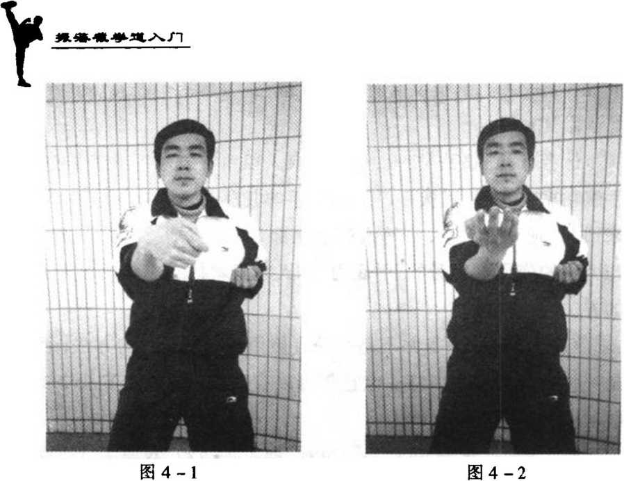 四指放松,拇指微屈扣,手 掌平摊,掌心向上,高与胸平;手 肘尽量内收,靠近胸前中线,肘 部离胸约一拳至一拳半远,手臂 肌肉保持松弛而富有弹性(图 4 - 2) o (