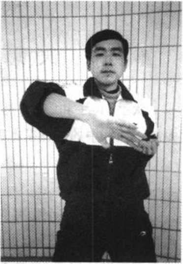 图4—3图4—3四指放松,拇指微屈扣,手 置胸前中线上;屈肘略大于90。 角,肘高与肩平。手臂肌肉保持 松弛而富有弹性(图4-3)。