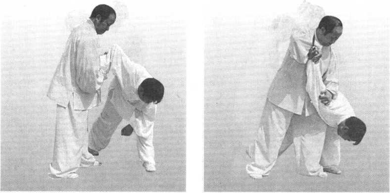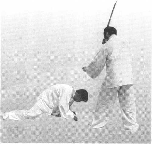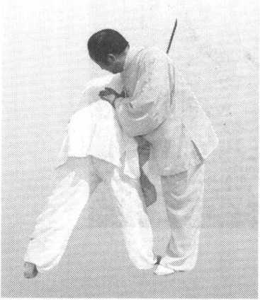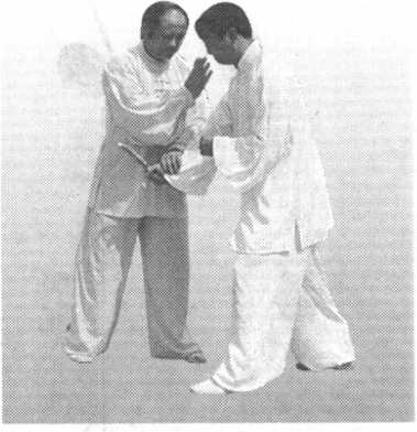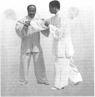 乙刺甲。甲向乙右侧上步,右转身,避过其锋,并擒握乙手腕。甲用 外旋劲釆拿乙右手腕,使乙前倾。甲继续左转身拧乙臂,使乙受制被擒。 对匕首要先迅速振脱匕首,然后进身施技于乙,折断其右臂,使其丧失战 斗力(图65、图66、图67、图68)。