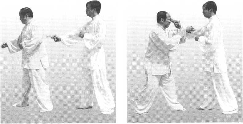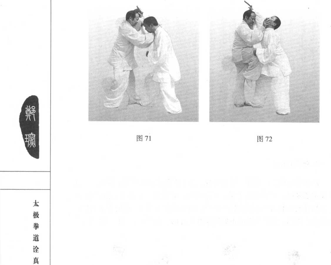 太极拳道诠太极拳道诠真真乙用手枪顶住甲后背。甲左转身,左手抓握格挡乙手臂,同时,出搓 掌叉击乙咽喉,用重手法上叉,不能留情。紧接着,甲左手上推乙右手, 右手扣住乙咽喉动脉血管或软骨喉管,用狠劲向下捋带。同时甲上右膝向 上顶击乙裆部,使乙毙命或丧失战斗力(图69、图70、图71、图72)。
