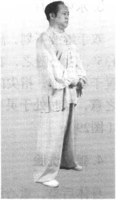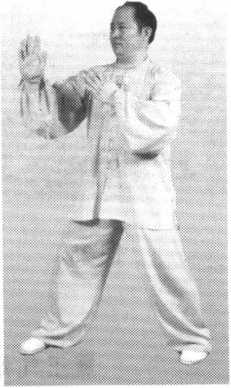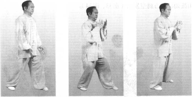 重心再向左腿前移上行;双掌内旋,弧形前按;身体和头部向前移动,前 额要上领;右脚向前上步与左脚平行,与肩同宽,双腿逐渐伸直(图31 )。