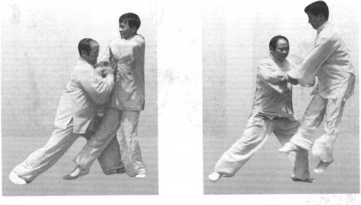(2) 当对方出右拳或右腿时,我上步同 时,右手抓其手或脚腕,左手托其肘或膝部,向右划弧,让空其劲,使其关节 引直,然后反转向左送劲贯在对方肩胯部和支撑脚脚跟,将对方发出。