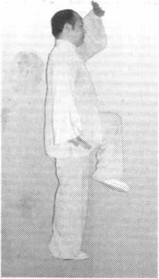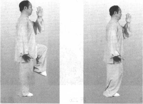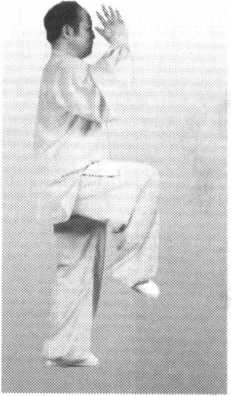 回收梳头绕头后沿下颏沿身前偏右下落,按 掌于右腿侧;同时,左手掌由下从身前绕头 梳头,从后沿左脸从下颏下翻掌上托;同 时,左膝上顶,脚离地,随顶膝上抬,右腿 直立;头部、上身中正,单腿支撑要稳,面 向北方(图224、图225、图226、图227)。