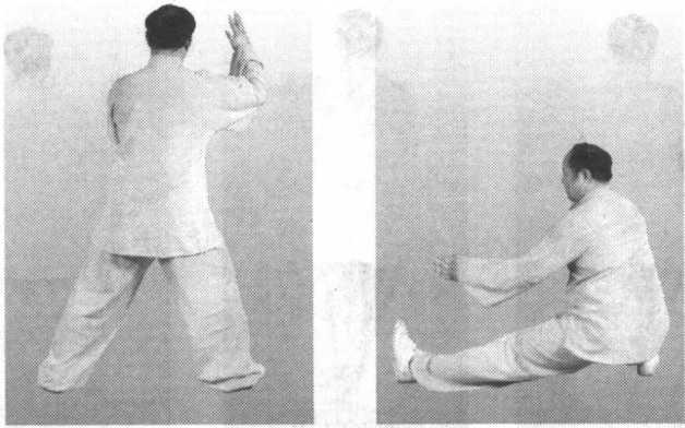 右腿蹲下,左腿仆地,脚尖朝上;随重心向下,身体下坐,带左掌由 脸前向左下劈掌,臂伸直,停于左腿上,右掌仍在右耳侧;仆下后身体尽 量要坐直,胯根松开,面向西南(图299)。