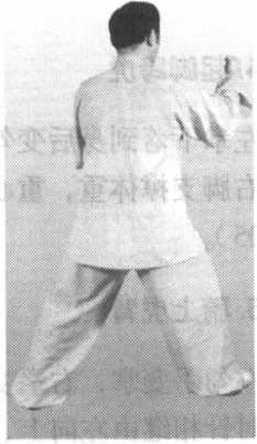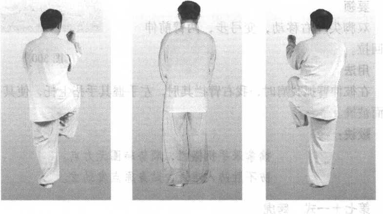 同时带动右膝上抬,脚下坠,左腿单腿支撑;头领身正,面向正西(图 302)。