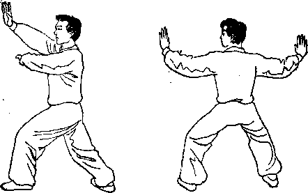 《接上式)身体转正成马步,背对圈心3两手外旋交叉 面前,左手在外,右手在内,向左右分开坠肘展劈(图5一 1—7),两掌心均向外。