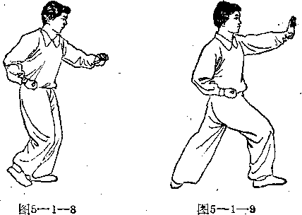 G接上式)右手握拳抱腰不动,身体前移起立,收右足 至左足后跟,足尖点地多同时左手往上向前搬握(图5—1一 8,打抓带回左肋旁,再向前猛推撞。接着」上右足扣步, 先实后虚,左足跟步坐实,腰随左手转动(图5-1-9) o