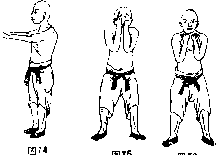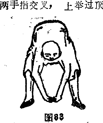 然后十指渐钩握拳住颔亥页下)再将十指散开两大指相并伸手过额又将小指相并十指渐钩握拳仍住颔颊下腕肘俱要紧贴(图77)