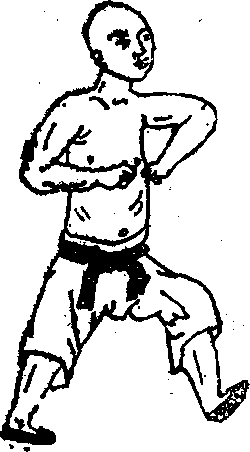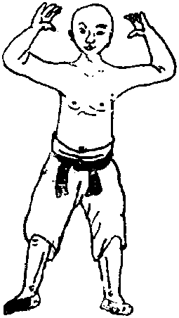 将两手分开由耳后毙至胸前握拳屈肘作圈式两拳遥对相离一尺八九寸手背朝上吞气一口。右亦相同。左右各三次共吞气六口(图81)