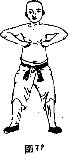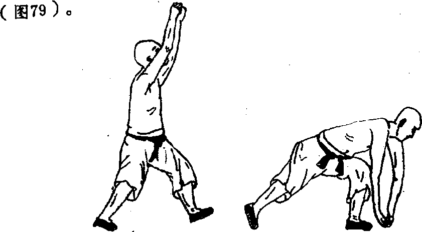 然后弯腰如作揖状反掌下按至脚背厂再合拱提起在膝须之间用力一甩身腰随直(图80)。
