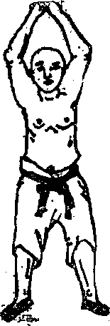 侧身斜立左腿屈右腿直两手指交叉用力上举过顶