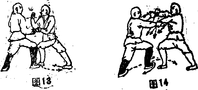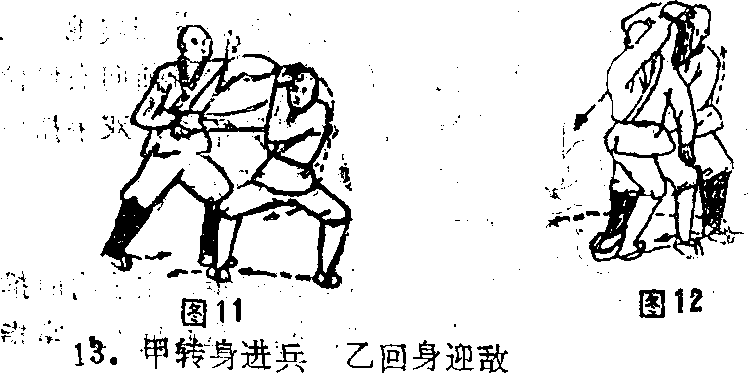 甲右脚碾地向左转体180度左脚后退一步,右腿屈膝成右弓步?右掌变拳冲击乙胸部拳心向上左掌护于左肋外侧掌心向前掌指向上目视乙胸部乙左脚向外碾地右脚抬起向前上一步两脚碾地向左转体180度,左腿屈膝成左弓步左手抓甲右手腕右掌变拳屈肘下压甲右小臂厂拳心向内目视甲胸部(图13)