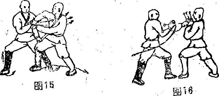 甲拾左翻向前上一步落于乙右脚外侧两脚碾地向右转体90度广有手翻腕又抓住乙右手腕经身前向右侧拉带左手按在在大腿上掌指向下乙两脚木动双手抓甲右手不放八向前西力推送互相目视(图15)