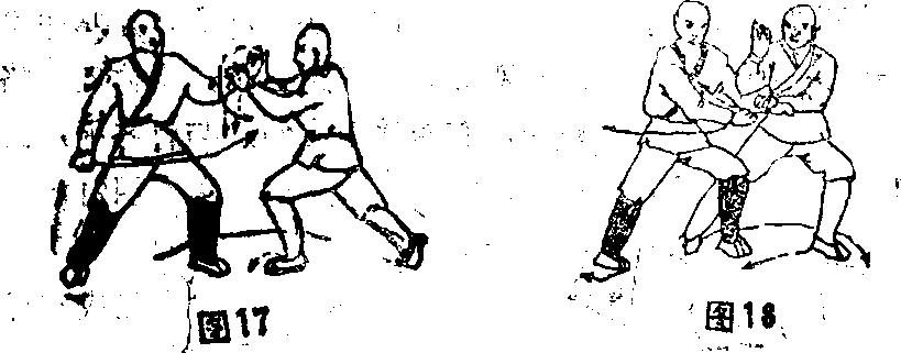 甲无等由前向下栽穿右拳向前冲击拳心同内目视双手乙看呻新上一步落于左膈外两脚碾地左转,左腿屈膝成弓也宠手抓甲左腕不放石压击甲左肘掌心向内目视甲两手(图18)