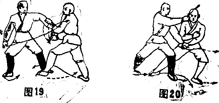 甲右脚碾地向右转体90度两腿变成高马步左手翻腕抓住乙左手腕右拳摆在右侧方拳心向内目视乙左手3乙左脚抬起向右前方落地两脚碾地向右转体90度抬右脚后退一簸畚地左腿屈膝成左弓步右掌护于胸前厂掌心向左拿羸面自觌甲左臂(图19)。