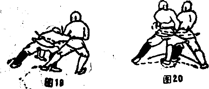 甲左脚外旋起身屈膝成右弓步右拳挎挑乙左臂左拿撑地收回护于右肋前侧掌心向右掌指向上目视乙乙左邮曜地臆左弓步左掌再穿进甲右腋下抱住甲往左电右掌护于左职前掌心向左掌指向上日母甲(图20)