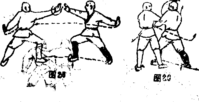 左下方广掌心向后,掌指向下目视乙乙左脚碾地,右脚抬起身体曜申向左转270度右腿在体后落地蹬直左腿屈膝成走号步八左掌仍抱住甲后腰右掌向甲右胸侧推击目视黑(图21)。