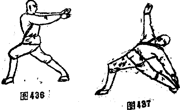 13 拗步后转两腿成弓步势双臂向身后扭伸。左右交督扭转练习腰部(图436)