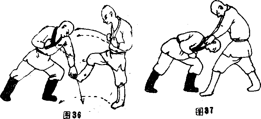 左手击甲右脚(图36)。甲乘乙出左手上体前俯时右脚落地左脚向前上一步速出双手拿住乙颈后部用力下按。