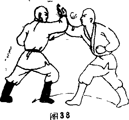 2 金肘破心乙右脚向前上步同时出右拳击甲头部。甲可左鲫向前上一步,出右手抓住乙右手腕部图38)而后突然秘开右手,右脚向前上一步用右肘端冲乙心窝使乙仰身倒下。(图39)
