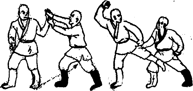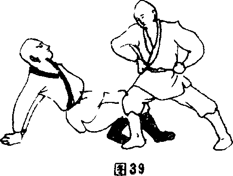 3空城放箭乙右脚上前一步出双手向甲扑去。甲用左手拦挡(图40),并抬左脚踢乙裆部。(图妇)