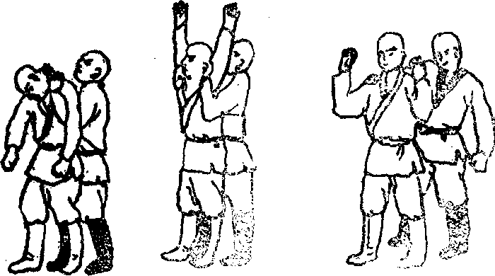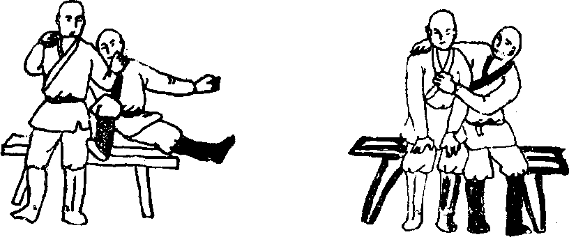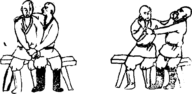 43 上挑崩拳如甲乙并排坐在凳上乙右手搭甲右肩上用左手抓住甲右手。(图120)甲可右臂屈肘上挑左手握拳向乙面部崩打。(图121)