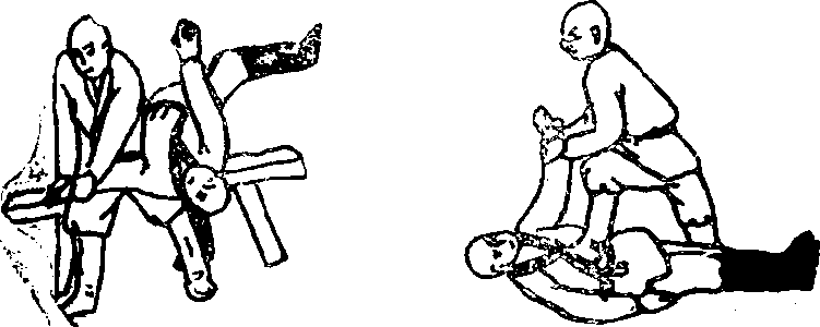 45 拧腕踏胸坐在凳子上如乙出右手抓甲右肩并用左手抓甲前胸。(图123)甲可乘乙不防突然出双手擒住乙左手两侧用力猛拧乙左手腕致乙仰身倒地。(图124)而后甲拧乙左手腕往上拉再用左脚踏乙胸肋骨。(图125)