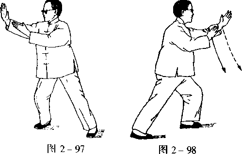 1 .接上势,两掌向西方伸出;同时右脚跟为轴,脚尖 转向南方;眼看右手。(图2—97)