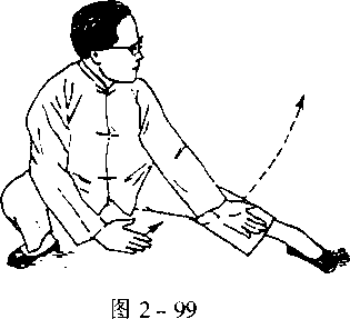 3 .右脚退后半步,脚跟为轴,脚尖转向西南,腰向后 倚,全身下蹲,左脚跟为轴,脚尖转向东南;同时两掌下沉; 眼看右掌,(图2—99)